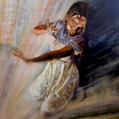 Obraz „Blask nie z tej ziemi” pokazuje dziewczynkę w lśniącej, białej sukience, która klęczy w silnym świetle. To światło można odczytać jako boskie – tak jasne i potężne, że aż ją oślepia. Dziewczynka zasłania się rękami, jakby próbowała ochronić się przed jego siłą.