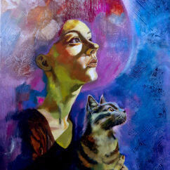 „Zanim się stanie” przedstawia kobietę i kota uchwyconych w tym samym momencie skupienia: oboje unoszą wzrok i kierują go w stronę niewidocznego dla widza punktu. Kompozycja jest kameralna, a jednocześnie napięta oczekiwaniem — postacie są blisko siebie, jakby łączyło je wspólne przeczucie. Dominują chłodne błękity i fiolety, przełamane akcentami światła oraz ciepłymi refleksami na twarzy i sierści. Tło o wypukłej fakturze reliefowej zbudowane pastą strukturalną tworzy wrażenie drgania przestrzeni, powietrza i czegoś „pomiędzy” — między tym, co już jest, a tym, co dopiero nadejdzie. Kot symbolizuje intuicyjne wyczuwanie tego, czego nie da się jeszcze nazwać. Kobieta odbiera to samo napięcie, ale inaczej: bardziej świadomie, emocjonalnie. Najważniejszym „obiektem” obrazu jest to, czego nie widać. Widz automatycznie zaczyna dopowiadać historię: czy to nadchodząca zmiana, zagrożenie, szansa a może cud.